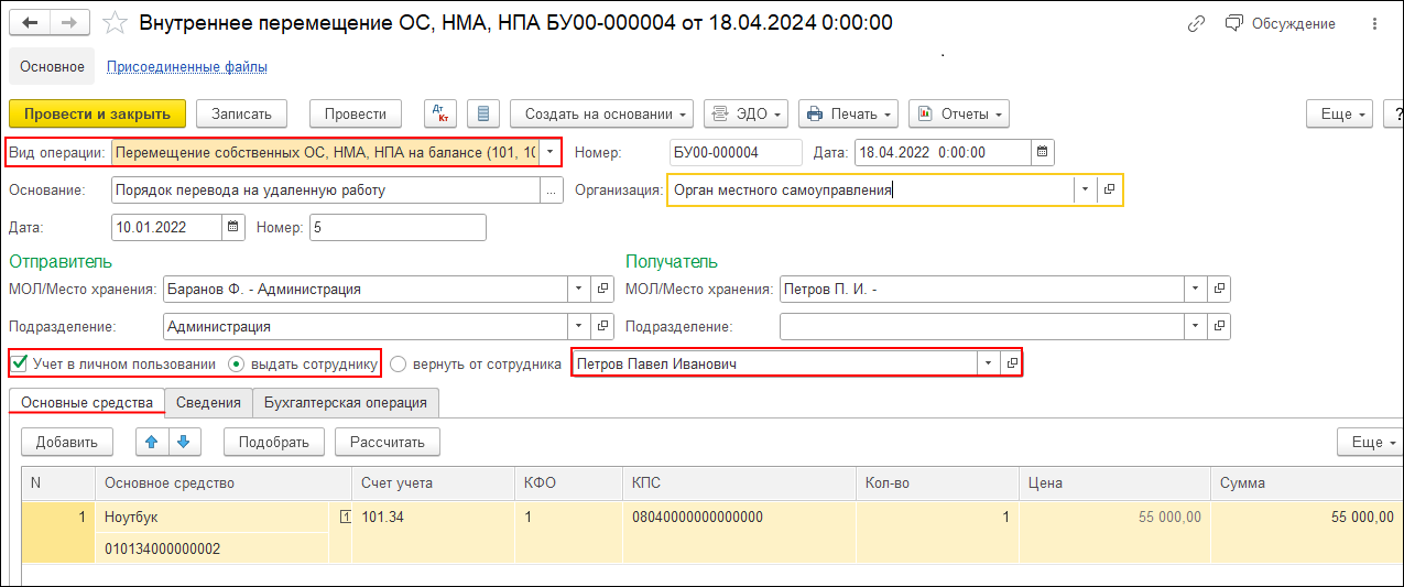 Пример интерфейса 1С:БГУ, операция Внутреннее перемещение