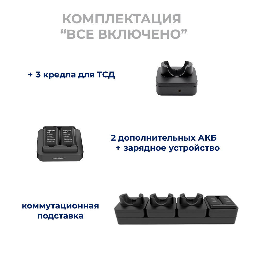 - Терминал сбора данных Chainway C61 х3 шт.: Android 13, 3Gb/32Gb; 2D ZEBRA SE4710, NFC, 4G, WIFI, BT, GPS, 13MP; Дисплей 4", 37 клавиш, 6700mAh, IP65 + кредл;