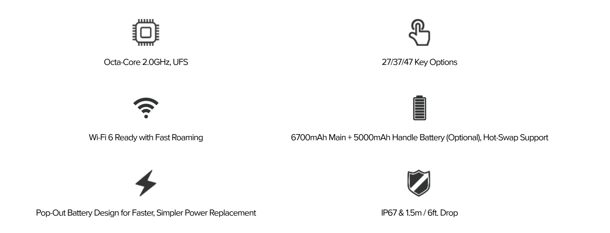 - Сканирование: Встроенный 2D-сканер штрих-кодов с различными опциями дальности считывания (стандартный или дальнобойный, например, Zebra SE5500 с дальностью до 12 м или SE5800 до 32 м). Доступные конфигурации сканеров: Zebra: SE4710/SE4750/SE4850/SE55/SE58 Honeywell: N6603/N6703/N6803FR; CM60
