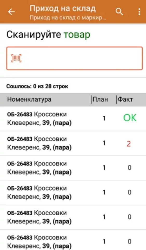 Приемка товаров и сверка план-факта на ТСД по Заказу поставщика или Приобретению товаров и услуг. Передача данных по фактическому количеству в 1С по Wi-Fi.
